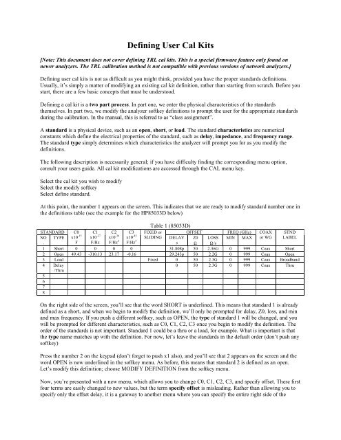 Defining User Cal Kits Agilent Network Analyzer Service